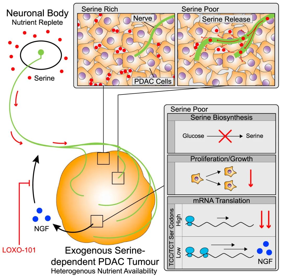 PDAC 细胞需要 Ser 来进行高效的 mRNA 翻译,Ser/Gly 剥夺选择性地降低了 PDAC 细胞 mRNA 的翻译效率,导致 ATP 需求下降,进而导致线粒体活性下降。另外,Ser/Gly 剥夺降低了 TCC 和 TCT 丝氨酸密码子的 mRNA 翻译效率,且选择性地允许 NGF 的选择性翻译和分泌,以促进肿瘤神经支配。