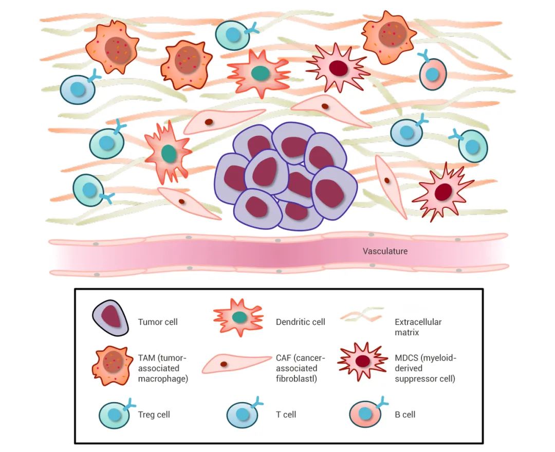 PDAC 的肿瘤微环境 (TME) 主要成分是细胞外基质 (ECM)、脉管系统、癌症相关的成纤维细胞 (CAFs)。PDAC 的 TME 包括了大量的致密的基质成分,例如 CAFs、胶原沉积、透明质酸等细胞外基质,多种免疫细胞,以及大量可溶性免疫抑制因子等。TME 不仅具有高度的免疫抑制作用,还与细胞分泌紊乱有关,并且与神经相互作用。TME 支持肿瘤生长和促进转移,同时作为药物传递的物理障碍。