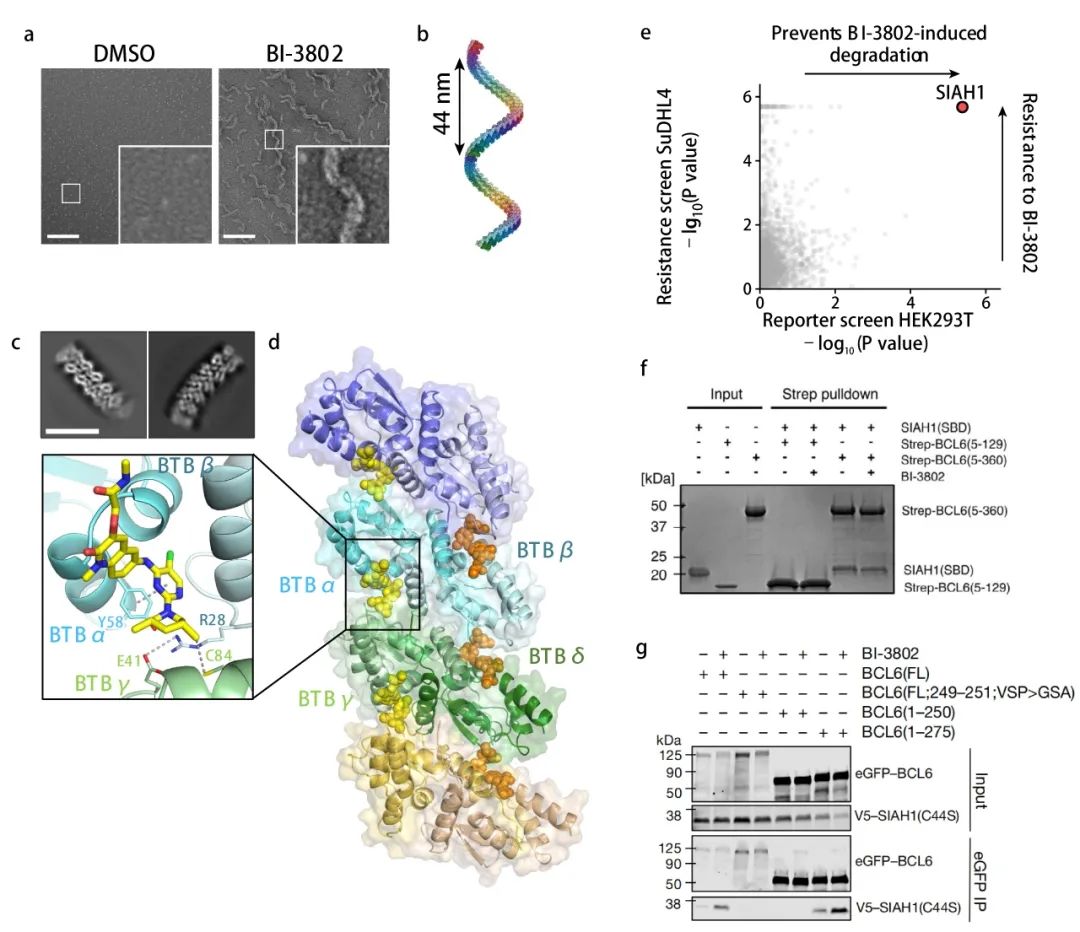 SIAH1 E3 泛素连接酶通过作用 BCL6 蛋白的 VxP 基序 (位于 BCL6 的 249-251 残基),降解 BI-3802 诱导聚集的蛋白。BI-3802 促进了 BCL6 蛋白和 SIAH1 之间的相互作用 (EC50= 640 nM),加速 BCL6 蛋白的泛素化和降解。