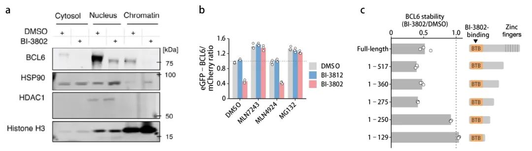 BI-3802 在不影响 BCL6 mRNA 水平的情况下,降低蛋白丰度并诱导其降解。该作用是通过靶向 BCL6 蛋白的 BTB (Bric-à-brac) 区域实现的。通过比较泛素——蛋白酶体途径中 E1 激活酶 (UBA1)、E3 连接酶 (NEDD8) 以及蛋白酶体的抑制剂作用发现,BI-3802 降解蛋白的机制是由非 Cullin E3 泛素连接酶介导的。