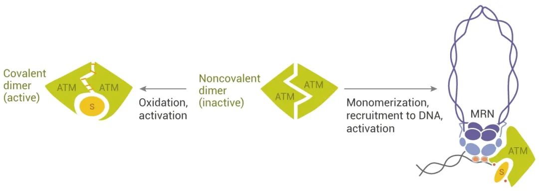 在生理条件下,ATM 通常作为同二聚体 (非活化状态) 主要存在细胞核中,被激活后,“相拥而眠”的 ATM 变为单体。 发生 DSB 后,异源三聚体 MRE11-RAD50-NBS1 (MRN) 复合物与 dsDNA 末端结合,介导了 ATM 招募到 DSB 位点,这个过程中伴随着 ATMS1981p 位点自磷酸化和 ATM 单体化,ATM 与 MRN 复合物的 NBS1 组分结合,以及 ATM 的蛋白激酶活性和底物亲和力的增加。ATMS367p、ATMS1893p 和 ATMS2996p 这些位点的自磷酸化作用也有助于 ATM 的单体化,另外,其单体化还依赖于通过 KAT5/Tip60 组蛋白乙酰转移酶乙酰化 (Ac) 作用形成 ATMK3016ac。