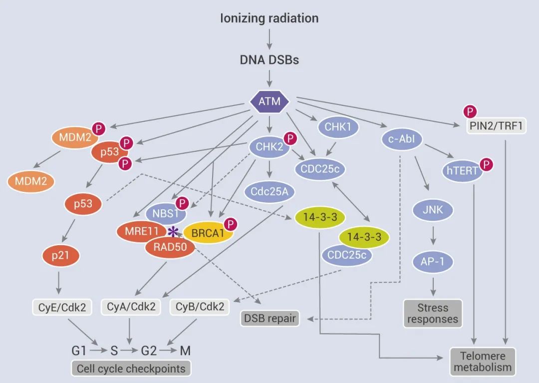 ATM 是 DSB 反应的主调节器,被 MRN 复合物完全激活后,原本静止的 ATM 变成一个“贪婪”的磷酸化机器。ATM 能磷酸化 700 多个底物蛋白上的丝氨酸/苏氨酸-谷氨酰胺基序 (S/T-Q motifs)。ATM 通过磷酸化下游多种蛋白,包括 p53、Chk2、BRCA1、 RPAp34、H2AX、SMC1、FANCD2、Rad17、Artemis 和 Nbs1 等,启动信号级联,参与细胞周期检查点控制、凋亡反应和 DNA 修复等。