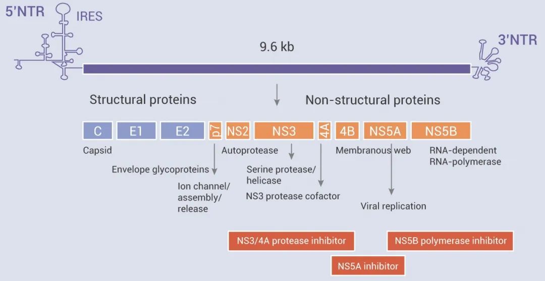 HCV 基因组大小约为 9.6 kb,编码三个结构蛋白 (Core, E1 和 E2),七个非结构蛋白 (NS2、NS3、NS4A、NS4B、NS5A 和 NS5B)。HCV 的非结构蛋白对于病毒复制是不可或缺的,例如,NS3 能与 NS4A 形成复合物并将 HCV 结构蛋白裂解为活性形式;NS4A 是将 NS3 锚定在胞内膜上形成 NS3/NS4A 复合物的辅助因子,参与 HCV 多聚蛋白翻译后加工,NS4A 还可以保护复合物不被蛋白水解降解;NS5B 是一种病毒 RNA 依赖性 RNA 聚合酶 (RdRp),被 NS3 和 NS5A 调控,是 HCV mRNA 复制和转录所必需的。