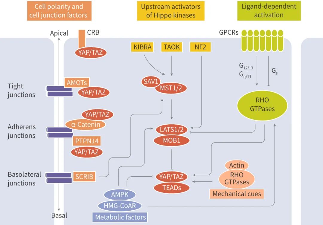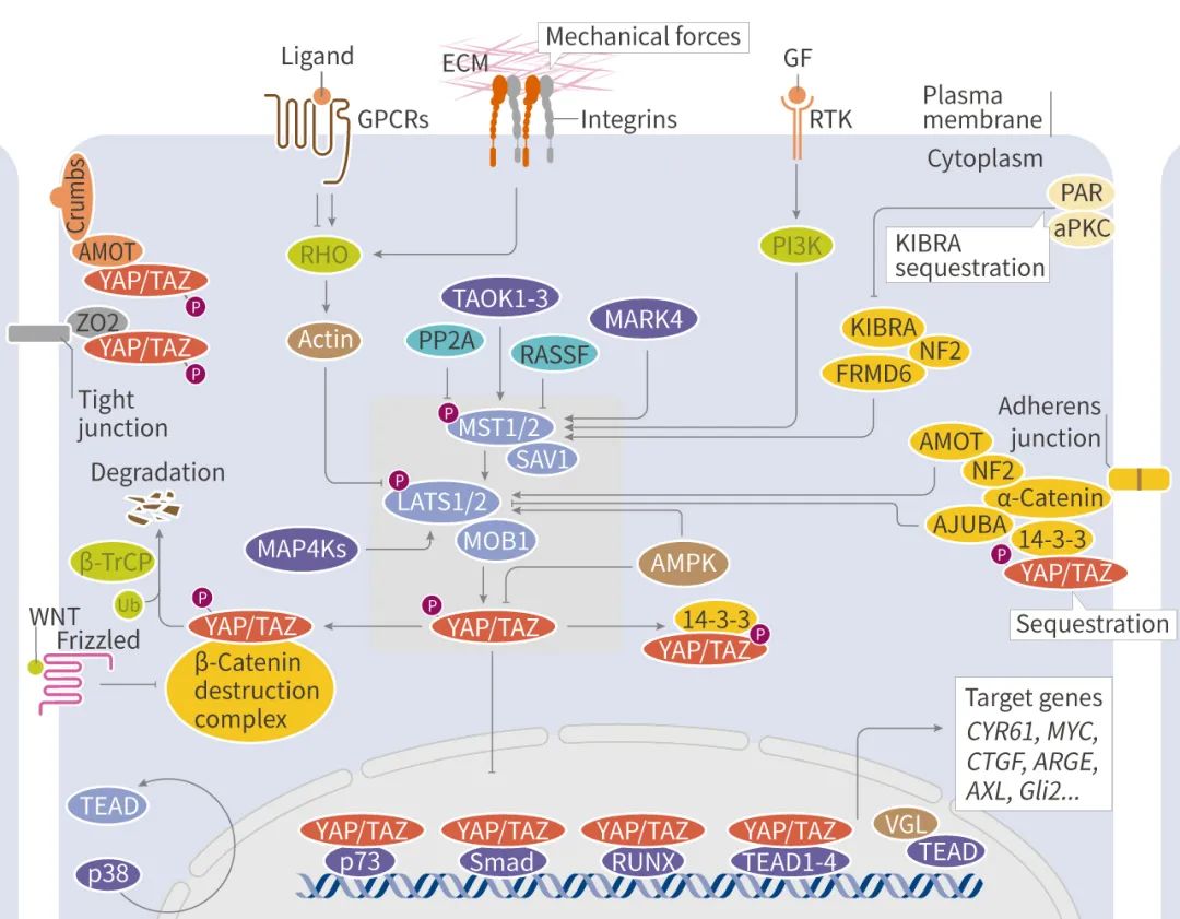 2) 细胞极性复合物和连接蛋白。极性和粘附蛋白,如 α-catenin、E-cadherin、CRUMBS 和 SCRIBBLE 复合物,可将 YAP/TAZ 隔离在细胞质中;