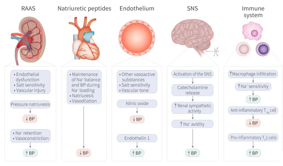 维持正常血压 (BP) 水平涉及一个综合的神经内分泌系统的各种要素的复杂相互作用,其中包括肾素-血管紧张素-醛固酮系统 (RAAS),利钠肽和内皮的作用,交感神经系统 (SNS) 和免疫系统。这些系统中任何一个系统的血压控制失常或破坏因素均可直接或间接导致血压异常,从而导致靶器官损伤或 CVD。