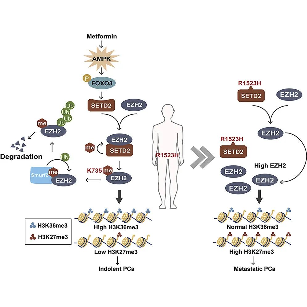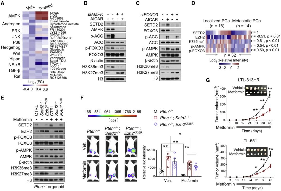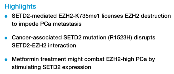 AMPK 激动剂 (Metformin 购自 MedChemExpress) 处理前列腺癌细胞实验的结果表明,AMPK 介导的 EZH2 磷酸化和 SETD2 的表达影响 EZH2 活性/水平。在体内,Metformin 的处理减少了 Pten 缺失细胞引起的肿瘤生长。总的来说,SETD2-EZH2 轴整合了代谢能感应和肿瘤发生。