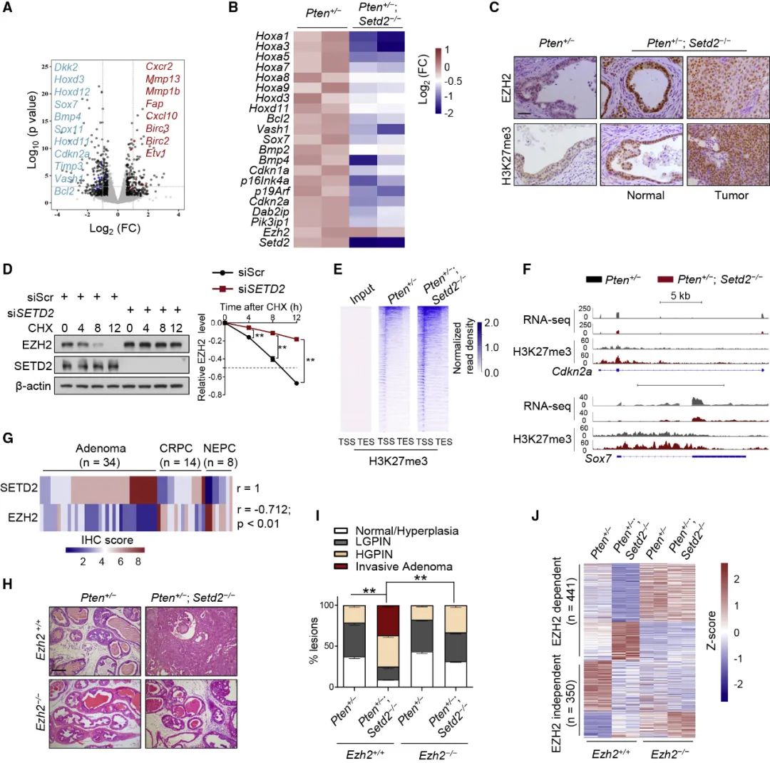为了确定 Setd2 基因丢失是否通过 EZH2 上调促进了前列腺癌的发生,通过 Setd2 敲除/不敲除的 Pten+/- 类器官中敲降 EZH2 或 EED/EZH2 抑制剂处理,以及 Pten+/-;Setd2-/- 小鼠中 Ezh2 缺失的肿瘤进展的观察 (MRI 和组织学分析) 和 SETD2 调控的基因表达分析,结果表明:Setd2 基因的丢失以 EZH2 依赖性的方式加速了前列腺肿瘤的发生。