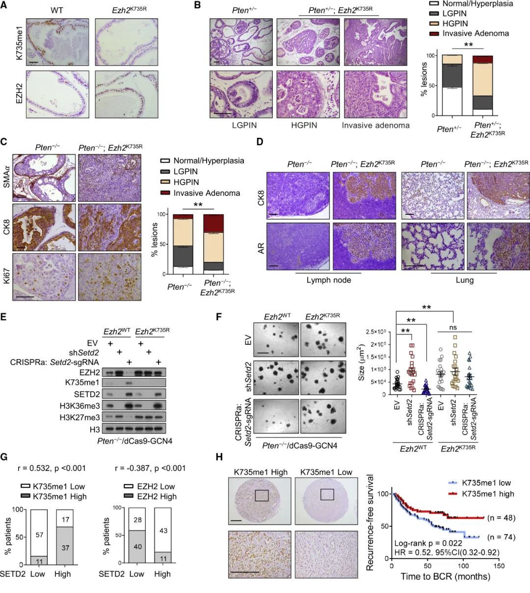 在带有纯合 K735R 敲入突变体 (Ezh2K735R) 小鼠中,通过组织 IHC、Setd2 敲降器官中指定蛋白质 IB 分析等表明,EZH2-K735me1 的缺失会增强 PCa 细胞进化为转移性 PCa 的能力。重要的是,SETD2 的敲降/过表达对来源 Pten-/-;Ezh2K735R 小鼠器官的生长都没有影响。此外,源于 2 个月大的 Pten-/- 与 Pten-/-;Ezh2K735R 小鼠器官转录组对比,与 H3K27me3 信号相关的 signature 显著富集,且在 Pten-/-;Ezh2K735R 细胞中,大约 60% 的 EZH2 依赖性 SETD2 的 signature 下调。总的来说,SETD2 的抑癌功能在很大程度上取决于它对 EZH2 的甲基化。