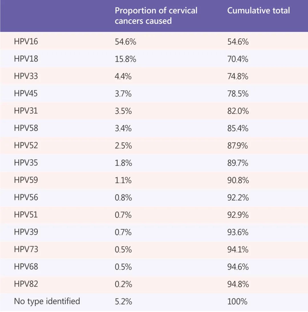 类型: 100 多种,至少 14 种是致癌的,两种 HPV 类型 16 和 18 引起 70% 的宫颈癌和癌前宫颈病变,大约 90% 的生殖器疣是由 6 和 11 型 HPV 引起的