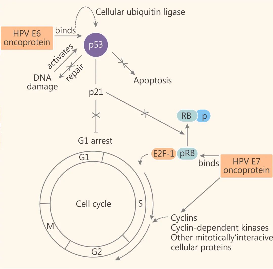 (E6 和 E7 编码的多功能蛋白与 p53 和 pRB 结合,破坏细胞周期的调节)