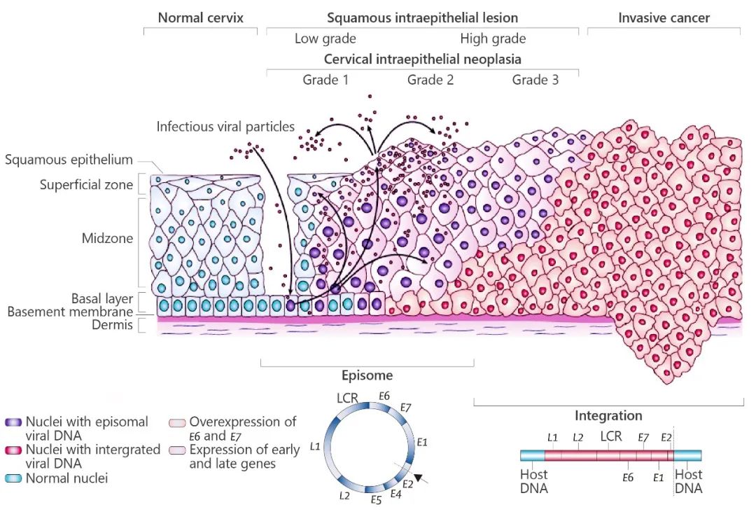 首先,HPV 被认为是通过宫颈上皮细胞的微擦伤进入并感染基底细胞。感染后,早期 HPV E1、E2、E4、E5、E6、E7 基因表达,病毒 DNA 从衣壳释放并作为游离 DNA 进入细胞核进行复制和扩增。在上皮的上层 (Midzone, Superficial zone),病毒基因组进一步复制,晚期基因 L1、 L2 和 E4 被表达,L1 和 L2 包住病毒基因组,在细胞核内形成子代病毒粒子。脱落的病毒可以引发新的感染,低级上皮内病变支持生产性病毒复制,未知数量的高危型病毒引起高级宫颈上皮内瘤样病变,未处理的病变进展为微侵袭和侵袭性癌症与 HPV 基因组整合到宿主染色体有关,伴随着 E2 的丢失或中断和随后的 E6 和 E7 癌基因表达上调[4]。