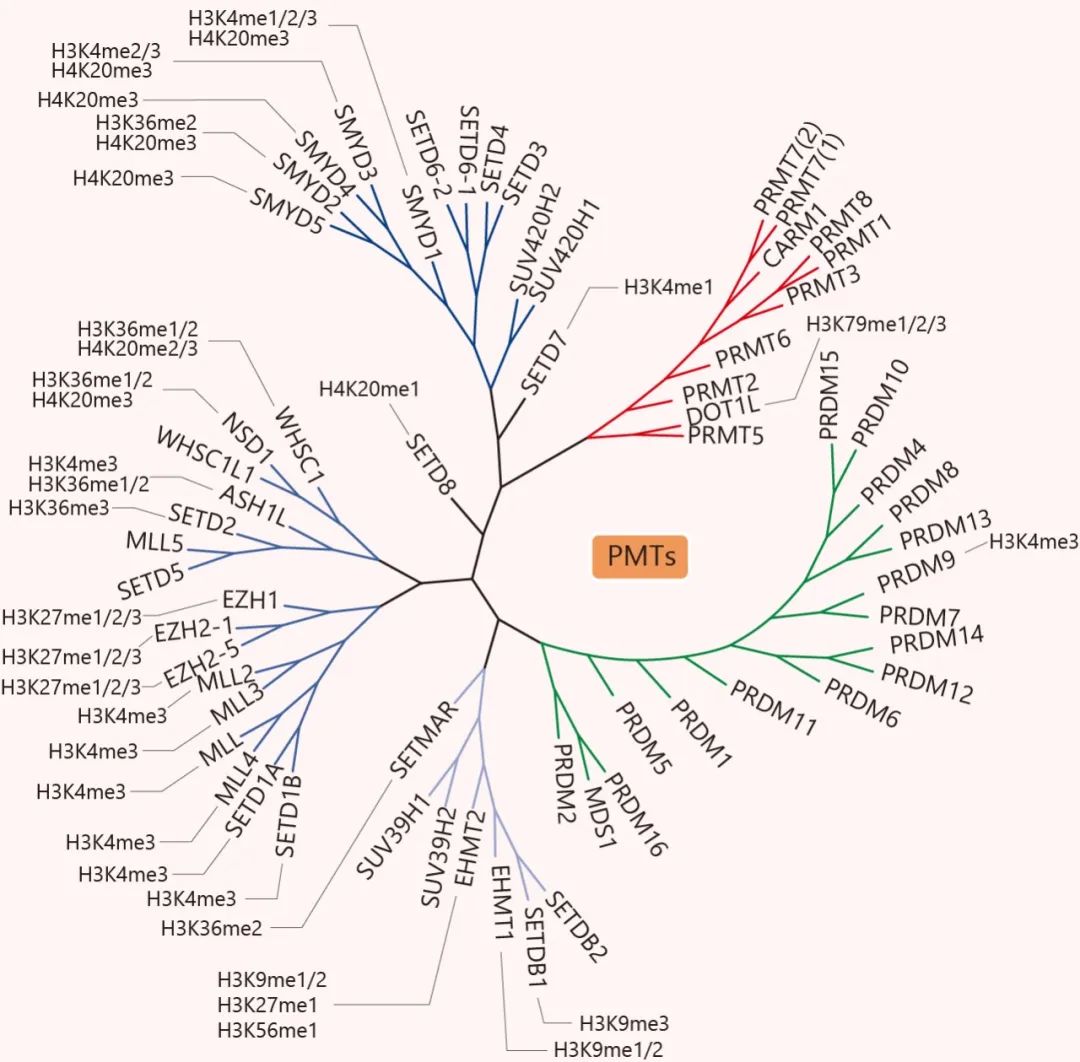 组蛋白甲基转移酶 (HMTs) 分为两类:赖氨酸甲基转移酶 (KMTs) 和精氨酸甲基转移酶 (PRMTs)。