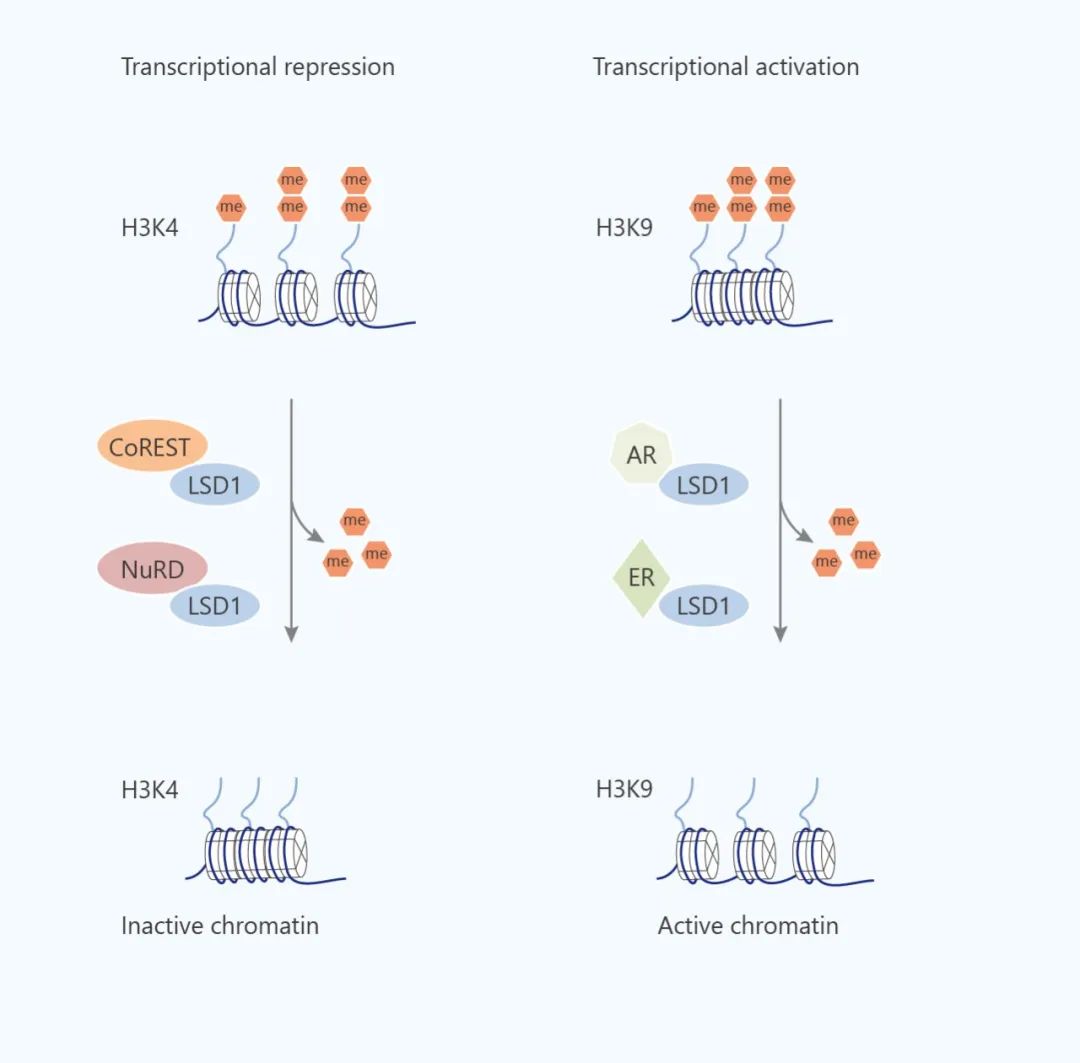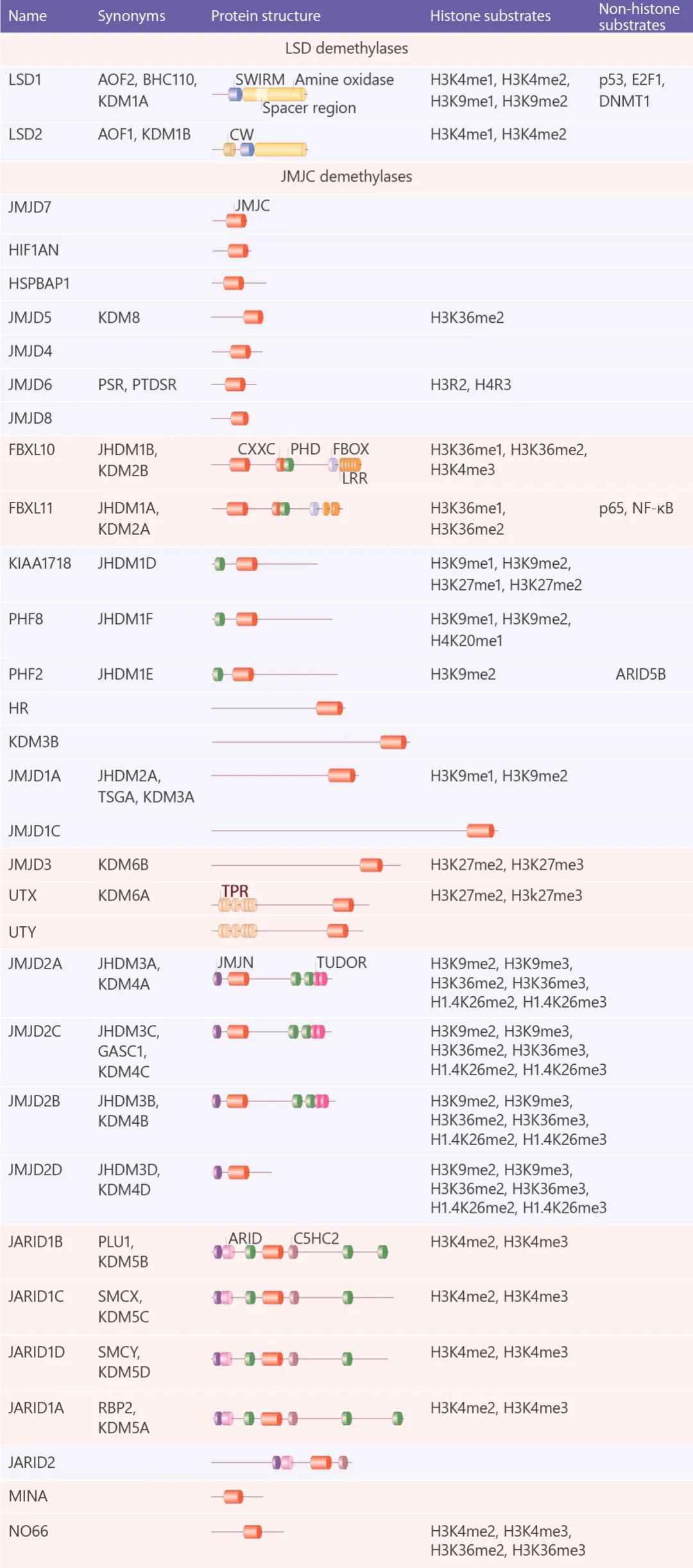 组蛋白去甲基化酶与转移酶的作用相反。组蛋白去甲基酶既能靶向组蛋白又能靶向非组蛋白底物。目前已经鉴定出两个进化上保守的组蛋白去甲基化酶家族:赖氨酸特异性去甲基化酶 (LSD) 和 Jumonji C (JMJC) 蛋白家族,它们利用不同的反应机理来去甲基。 LSD 蛋白家族由 LSD1 和 LSD2 组成,它们通过 FAD 依赖的胺氧化反应 (flavin adenine dinucleotide-dependent amineoxidase) 对单和二甲基化的赖氨酸残基进行脱甲基化。其中 LSD1 (KDM1A) 是第一个发现的组蛋白赖氨酸脱甲基酶 (KDM), 催化 H3K4me1/2, H3K9me1/2 的脱甲基化,另外,LSD1 也可以对非组蛋白脱甲基化,如 p53 上的 K370me1 和 K370me2, DNMT1 上的 Lys1096 和 E2F1 上的 Lys185。