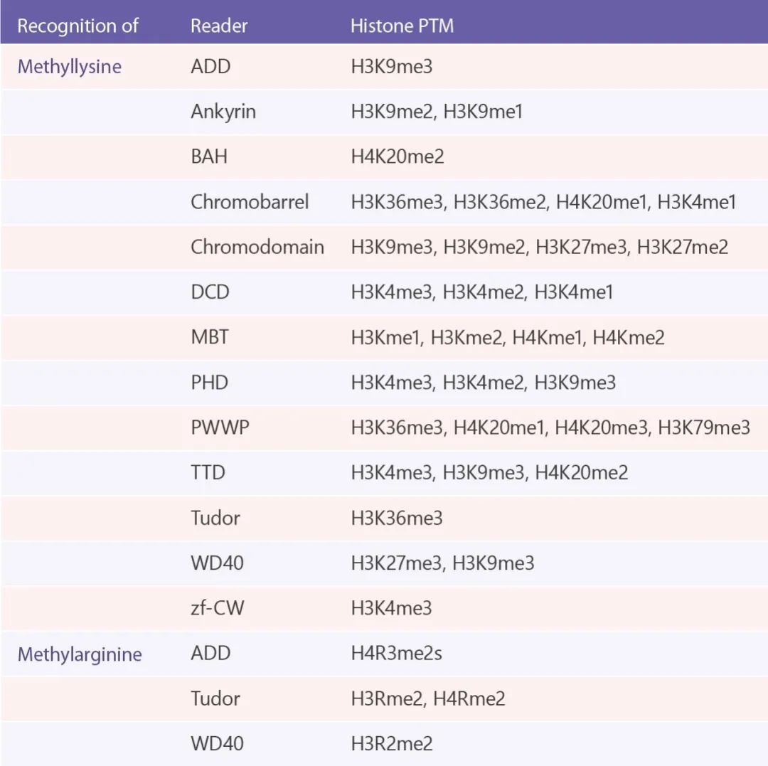 组蛋白甲基化阅读器 (注: PTM: 蛋白翻译后修饰)[10]